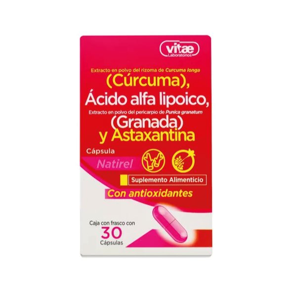 Alfa Lipoico 100 mg Astaxantina 33 mg Calcio 99.56 mg Curcuma 200 mg Fosforo 76.94 mg Granada 50 mg Magnesio 420 mcg